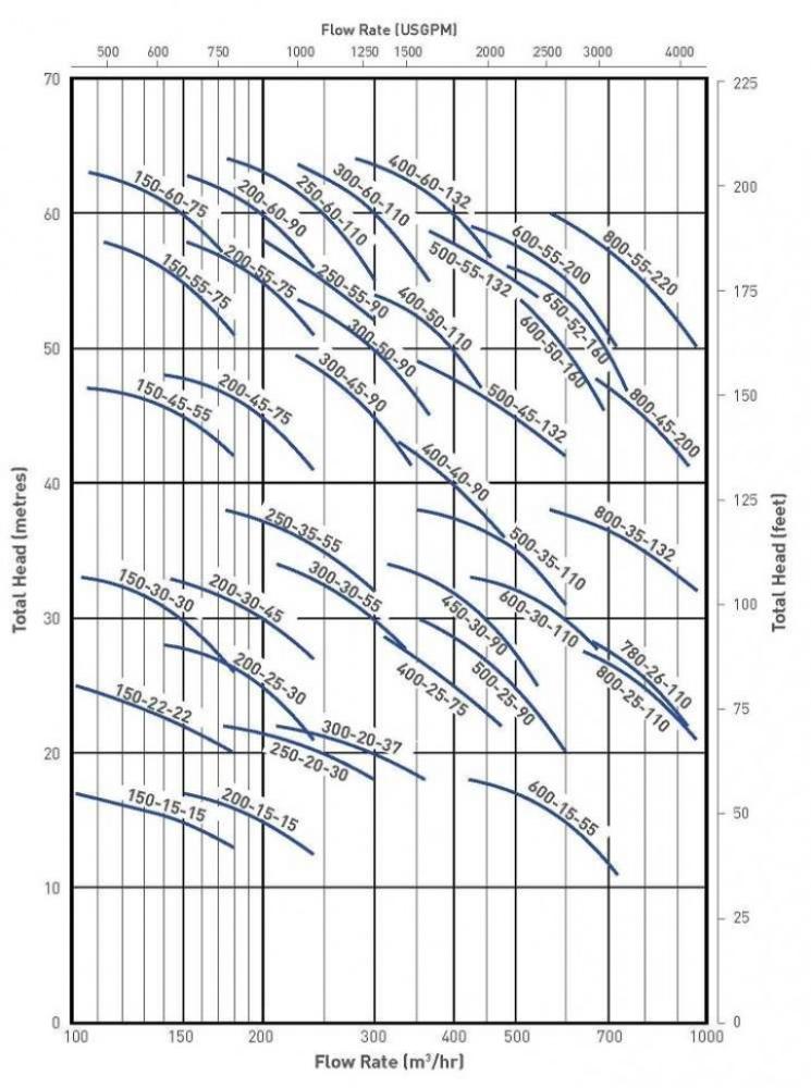 Модельный ряд включает насосы с диаметром выходного патрубка от 80 до 400, что позволяет получить производительность от 23 до 2400 кубометров в час с давлением до 64 м.вод.ст