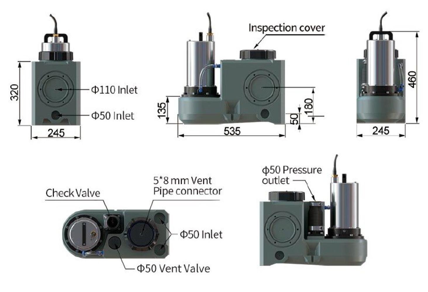 - Входы: 3×Φ110, 5×Φ50 – Выход напорный: 1×Φ50 мм
