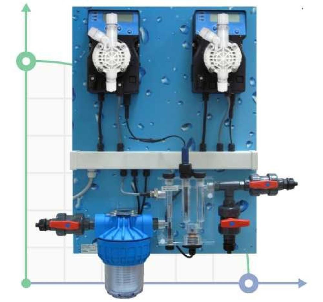 В основе системы – дозирующие насосы DLX PH-RX-CL/M со встроенными контроллерами рН/Rx/Cl (на выбор) и проточный амперометрический датчик свободного хлора SCLO 3 HYCHLOR •