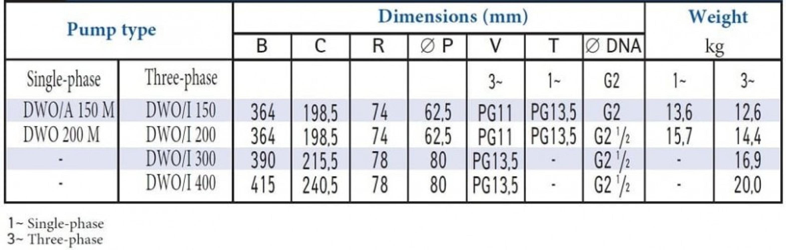 Технические данные: производительность до 66 м3/ч; высота подачи до 18 м; асинхронный 2 полюсный двигатель; класс изоляции F; степень защиты IP 55; однофазные 220V, 50Гц, трехфазные 380V, 50Гц; встроенный конденсатор и автоматическая защита от тепловой перегрузки для однофазной версии; для трехфазной версии защиту от тепловой перегрузки должен обеспечить потребитель; входной патрубок 2" 1/2 для DWO 300-400, 2" для других моделей; выходной патрубок 2".