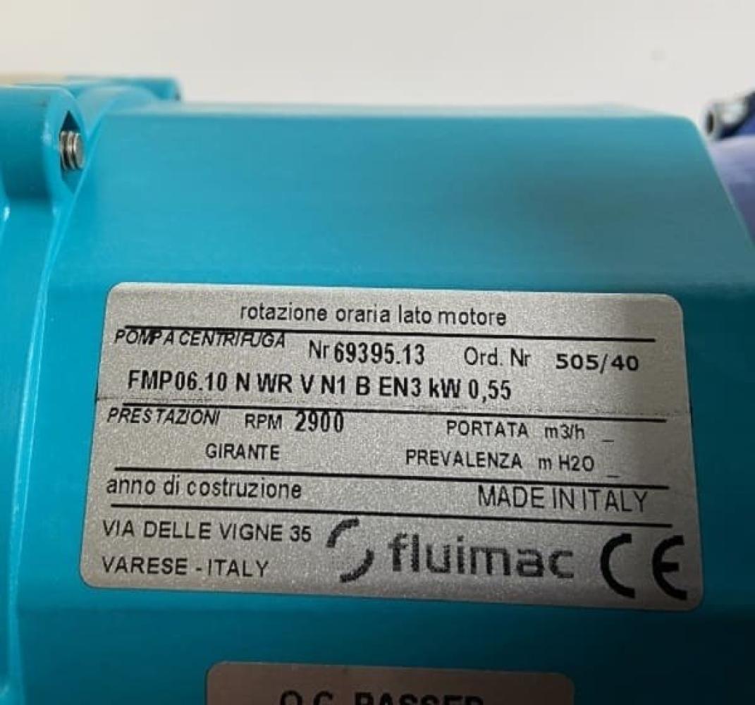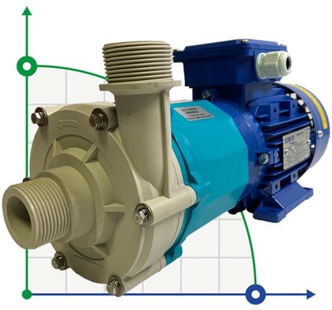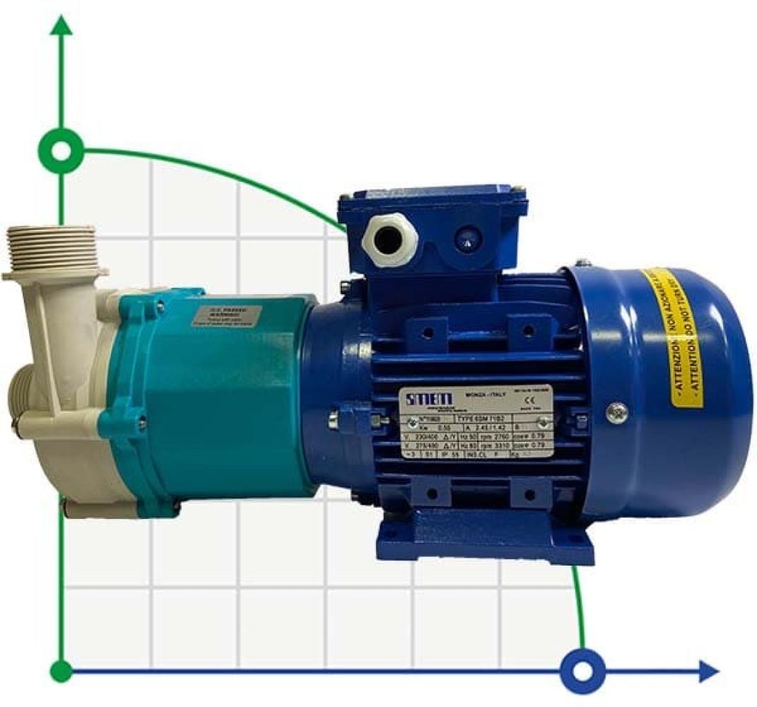 Герметичный насос с магнитной муфтой FLUIMAC FMP-06.10 PP (аналог насоса Argal TMP 06.10) предназначен для перекачивания химически активных сред. Конструкция насоса предусматривает умеренную толщину стенок и рассчитана на применение в условиях средних или небольших нагрузок. Насосная часть изготовлена из полипропилена, манжетное уплотнение Viton (полимер), трехфазный двигатель 0,55 кВт, резьбовое соединение, диаметр выпускного патрубка 25,5 мм. Производительность насоса FMP 06.10 составляет от 2 до 12 м3/час (от 33 до 200 л/мин), а высота подачи до 12 метров. При этом рабочая точка расхода 6 м3/ч (100 л/мин) при напоре 9,7 метров. Насос рассчитан на перекачивание жидкостей разной плотности. Базовый двигатель 0,55 кВт рассчитан на плотность до 1,05 кг/дм3.