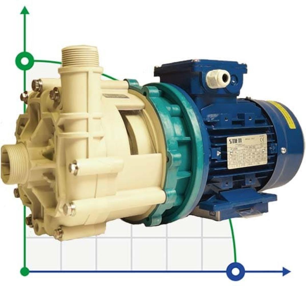 Центробежный насос FMZ 10.10 с механическим уплотнением TS6 Al203/SiC/el, насосная часть из полипропилена, манжетное уплотнение Viton (полимер), резьбовое соединение BSP, трехфазный двигатель ІЕ2 F стандартний 1, 1 кВт 400В 50 Гц, резьбовое соединение вьпускного патрубка 1" 1/4, резьбовое соединение всасывающего патрубка 1" 1/2.