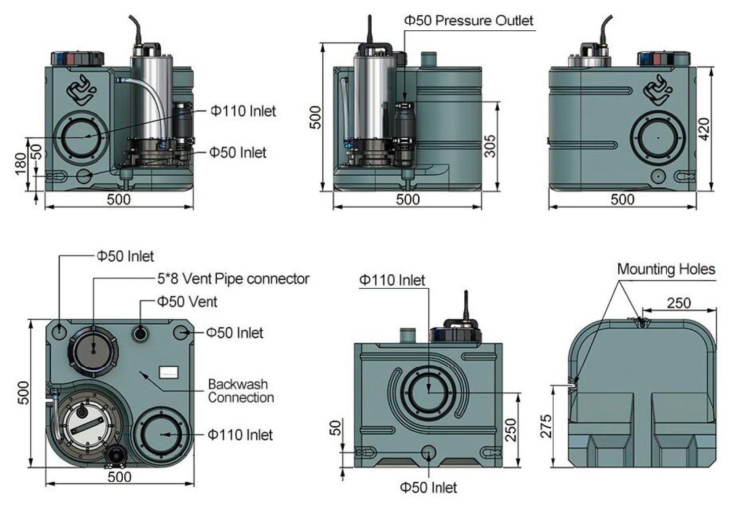 - входные отверстия: 4 ×Φ110, 5 ×Φ50