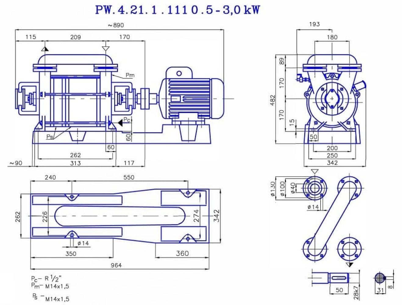 Водокольцевые вакуумные насосы серии PW.4.21 представляют собой двухступенчатые вакуумные насосы. Они предназначены для всасывания и перекачки сухого газа с температурой до 150°С и насыщенные парами газы, отличающиеся тем, что их температура не превышает 100°С, с возможностью применения рабочих жидкостей с вязкостью до 60 мм 2 /сек и плотностью 800 – 1200 кг/м3, температура воды на выходе из насоса не должна превышать 80°С. В насосах серии PW – насос и двигатель крепятся на общей опоре. Крутящий момент от двигателя передается к импеллеру через вал, установленный в подшипниках опоры и эластичную соединительную муфту. Такая конструкция делает вакуумный насос заметно длиннее и тяжелее, но благодаря этому заметно облегчает его обслуживание, когда требуется разборка насоса или замена двигателя. Кроме того, насос установлен на двух опорах (рабочее колесо между подшипниками), что дает более длительный срок эксплуатации.