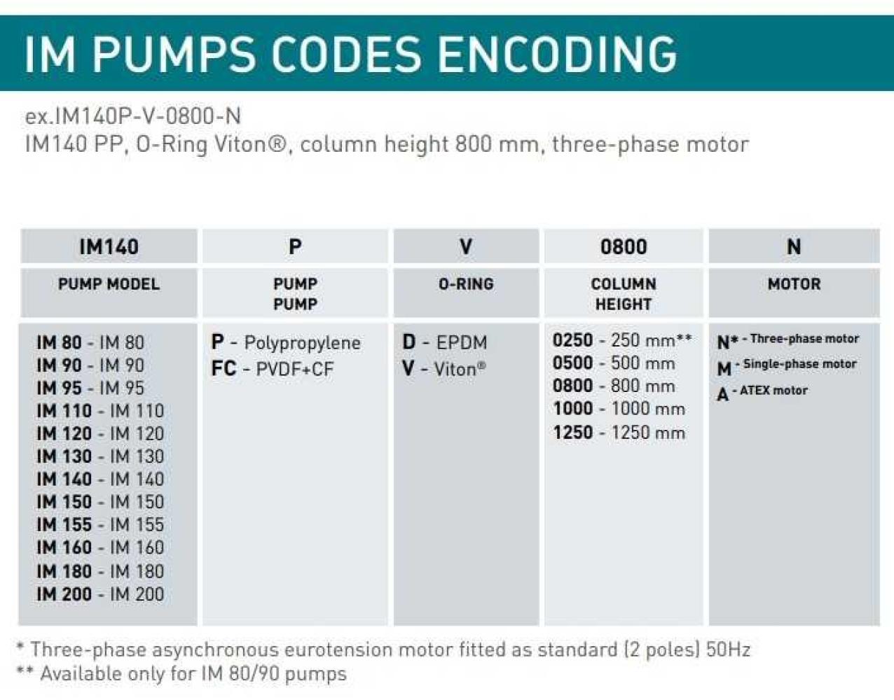 Вертикальные полупогружные химические насосы серии IM из полимера имеют высокую производительность и предназначены для стационарной установки на емкость с непосредственным погружением в емкость, их приводит в действие электрический двигатель с прямым приводом (max. 3000 rpm) используются для быстрого откачивания жидкости с расходом от 16 до 55 м3/час.