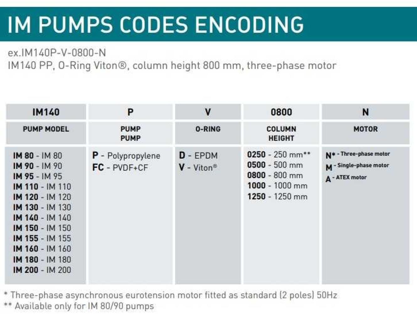 Вертикальные полупогружные химические насосы серии IM из полимера имеют высокую производительность и предназначены для стационарной установки на емкость с непосредственным погружением в емкость, их приводит в действие электрический двигатель с прямым приводом (max. 3000 rpm) используются для быстрого откачивания жидкости с расходом от 16 до 55 м3/час.