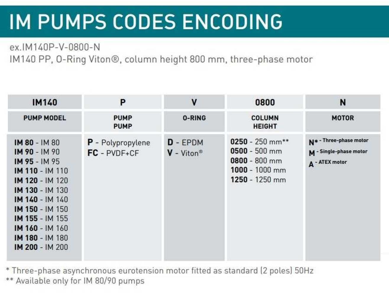 Вертикальные полупогружные химические насосы серии IM из полимера имеют высокую производительность и предназначены для стационарной установки на емкость с непосредственным погружением в емкость, их приводит в действие электрический двигатель с прямым приводом (max. 3000 rpm) используются для быстрого откачивания жидкости с расходом от 16 до 55 м3/час.