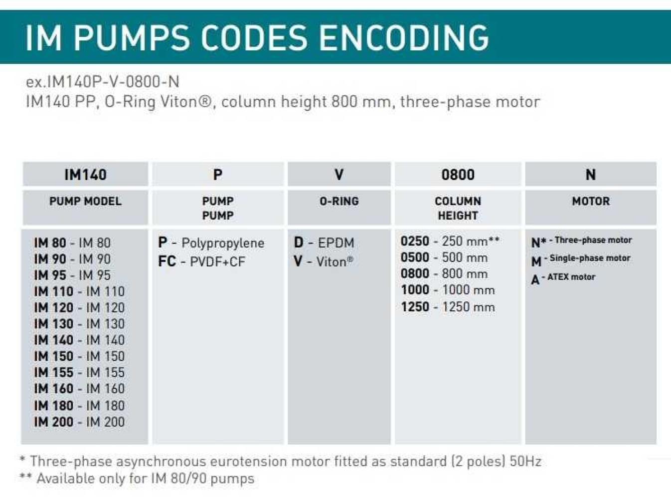 Вертикальные полупогружные химические насосы серии IM из полимера имеют высокую производительность и предназначены для стационарной установки на емкость с непосредственным погружением в емкость, их приводит в действие электрический двигатель с прямым приводом (max. 3000 rpm) используются для быстрого откачивания жидкости с расходом от 16 до 55 м3/час.