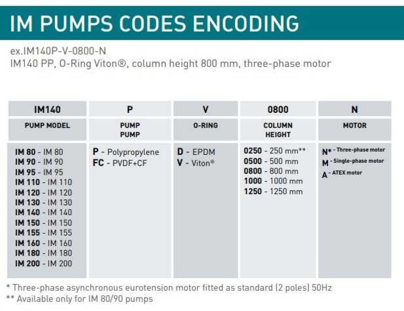 Вертикальные полупогружные химические насосы серии IM из полимера имеют высокую производительность и предназначены для стационарной установки на емкость с непосредственным погружением в емкость, их приводит в действие электрический двигатель с прямым приводом (max. 3000 rpm) используются для быстрого откачивания жидкости с расходом от 16 до 55 м3/час.