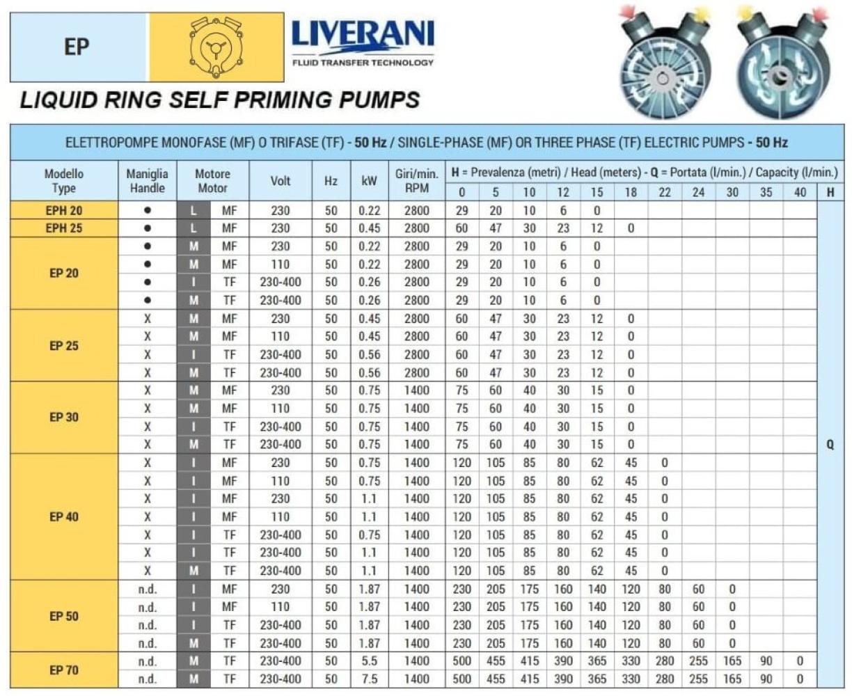 Жидкостные кольцевые насосы, реверсивные, пригодны для перекачки чистых жидкостей без твердых частиц с максимальной вязкостью 100 сП. Насосы доступны как из нержавеющей стали AISI 316, так и из бронзы. В зависимости от материала изготовления насосы находят широкое применение в различных отраслях: виноделии и пищевой промышленности (вино, сусло, уксус, масло, фруктовые соки, пиво, сиропы и рассол), молочной промышленности (молоко, сыворотка и т.п.), химическая промышленность (кислоты, растворители, фотографические жидкости, средства для (антикриптогамные средства, жидкие удобрения, газойль и т.п.), судоходство (морская вода, пресная вода, газойль и т.п.).