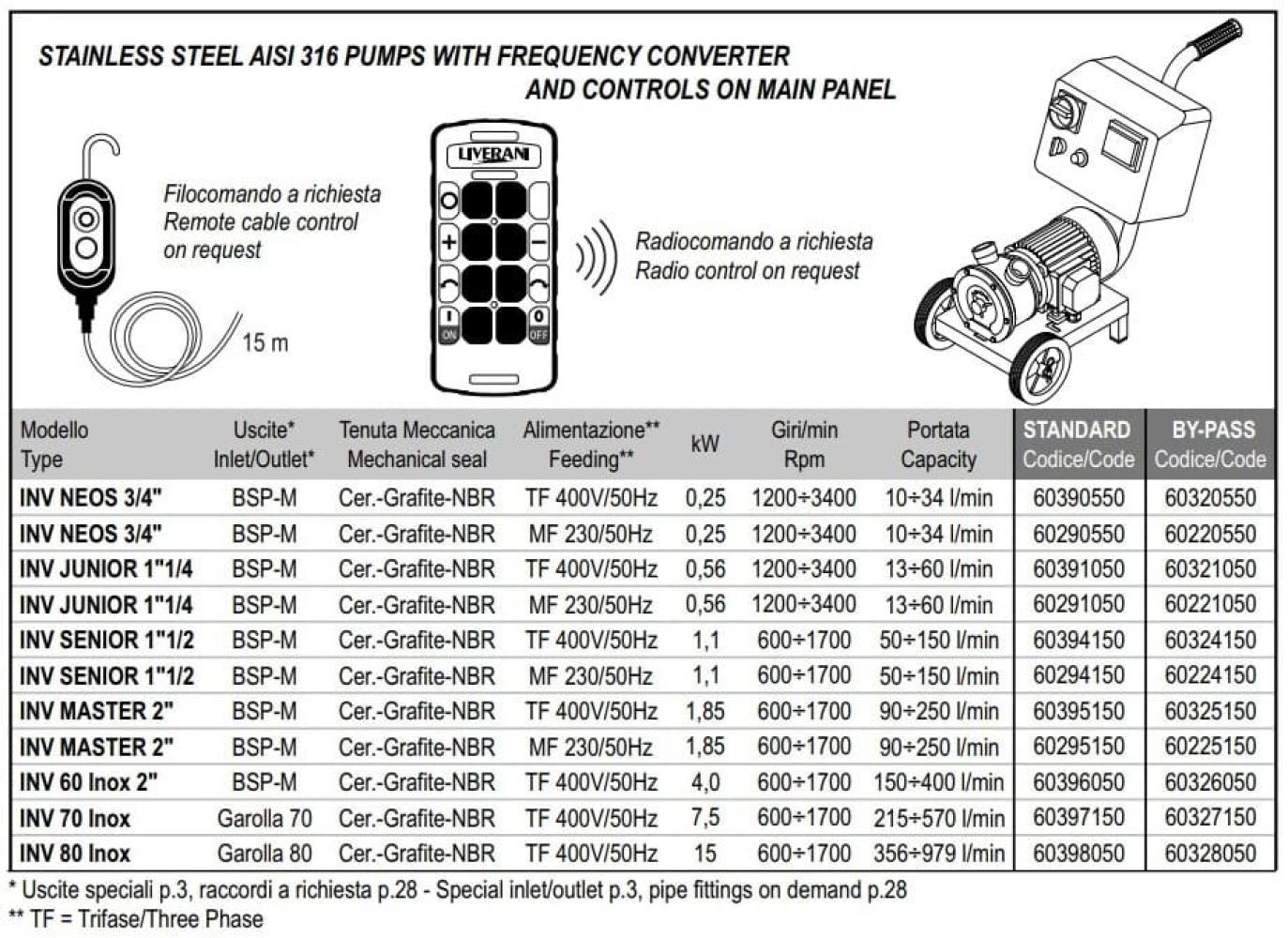 Жидкостные кольцевые насосы, реверсивные, пригодны для перекачки чистых жидкостей без твердых частиц с максимальной вязкостью 100 сП. Насосы доступны как из нержавеющей стали AISI 316, так и из бронзы. В зависимости от материала изготовления насосы находят широкое применение в различных отраслях: виноделии и пищевой промышленности (вино, сусло, уксус, масло, фруктовые соки, пиво, сиропы и рассол), молочной промышленности (молоко, сыворотка и т.п.), химическая промышленность (кислоты, растворители, фотографические жидкости, средства для (антикриптогамные средства, жидкие удобрения, газойль и т.п.), судоходство (морская вода, пресная вода, газойль и т.п.).