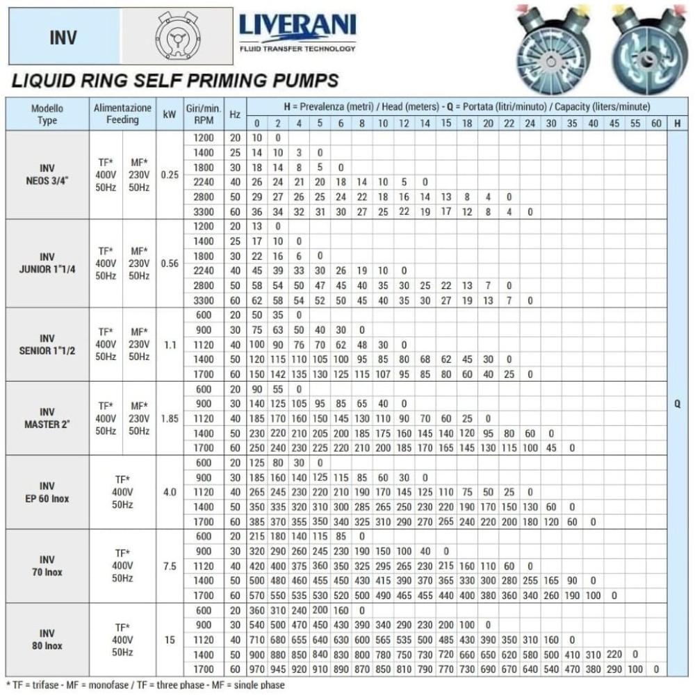 Жидкостные кольцевые насосы, реверсивные, пригодны для перекачки чистых жидкостей без твердых частиц с максимальной вязкостью 100 сП. Насосы доступны как из нержавеющей стали AISI 316, так и из бронзы. В зависимости от материала изготовления насосы находят широкое применение в различных отраслях: виноделии и пищевой промышленности (вино, сусло, уксус, масло, фруктовые соки, пиво, сиропы и рассол), молочной промышленности (молоко, сыворотка и т.п.), химическая промышленность (кислоты, растворители, фотографические жидкости, средства для (антикриптогамные средства, жидкие удобрения, газойль и т.п.), судоходство (морская вода, пресная вода, газойль и т.п.).