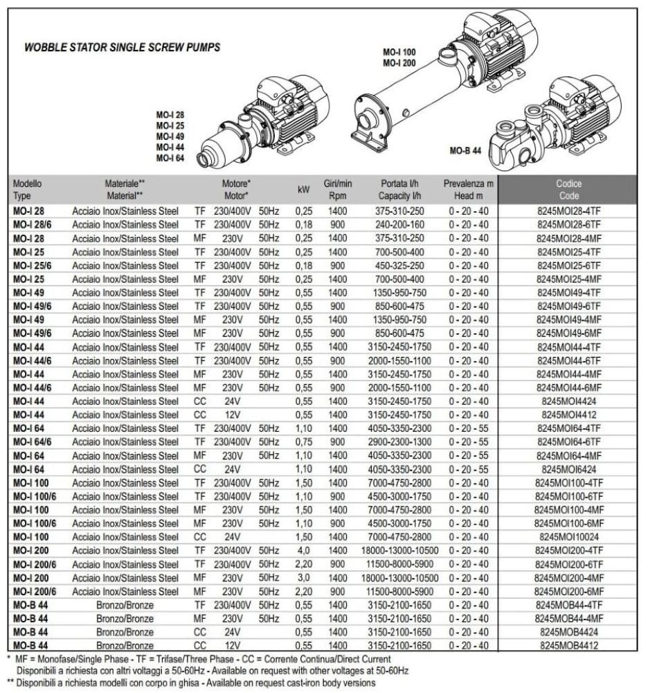 Винтовые насосы с корпусом из нержавеющей стали для перекачки пищевых и химических жидкостей, густых жидкостей, содержащих твердые частицы в суспензии, вязких жидкостей, таких как оливковое масло, и, в общем, всех пищевых масел.